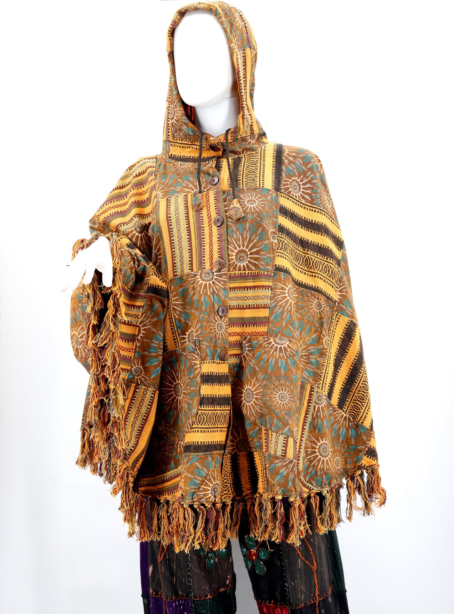 Introducing our latest Geometric Pattern and Flower of Life Print Patchwork Buttoned Poncho. Stock is limited for the inter and Spring Seasons get yours while stock lasts!