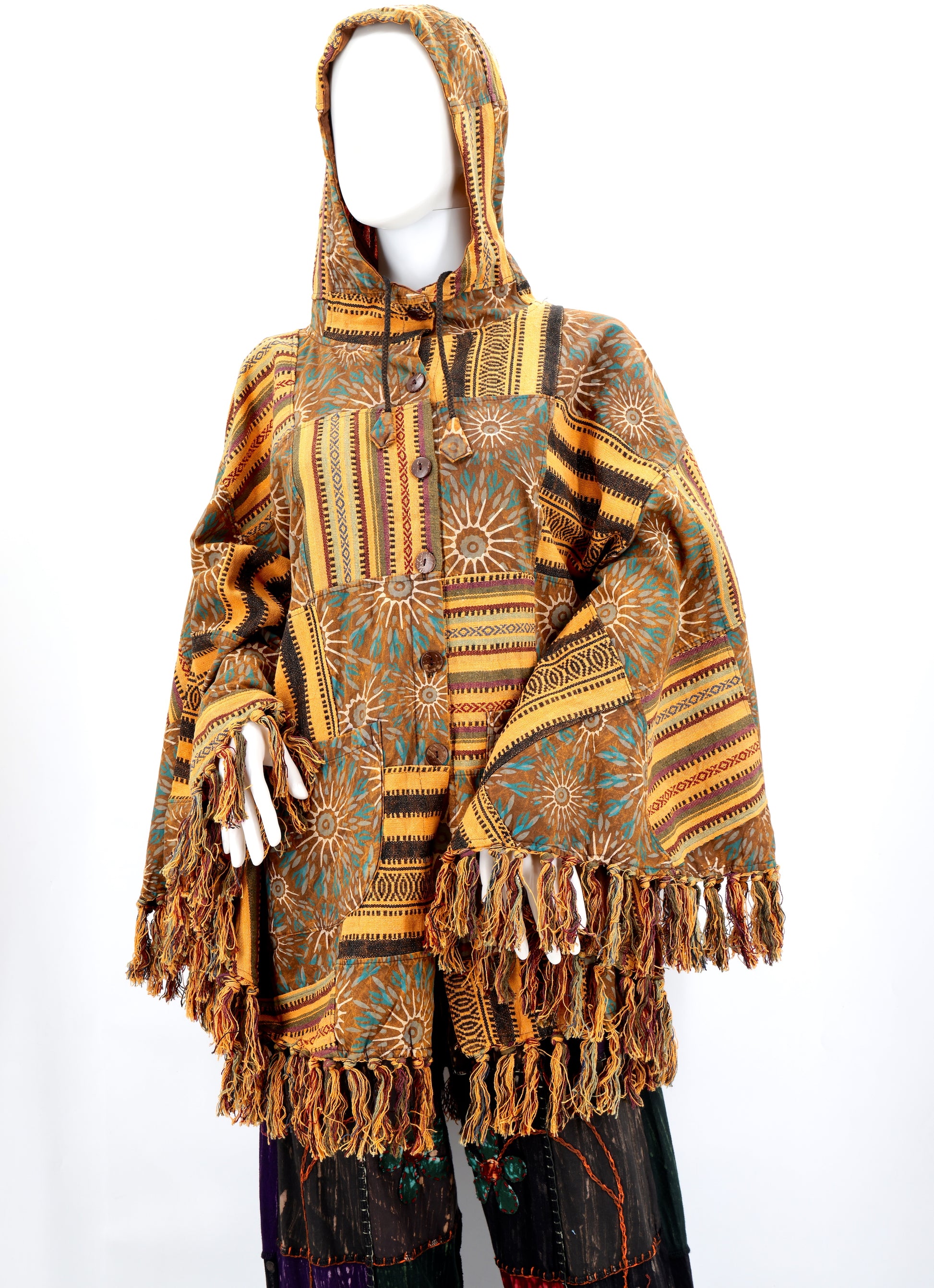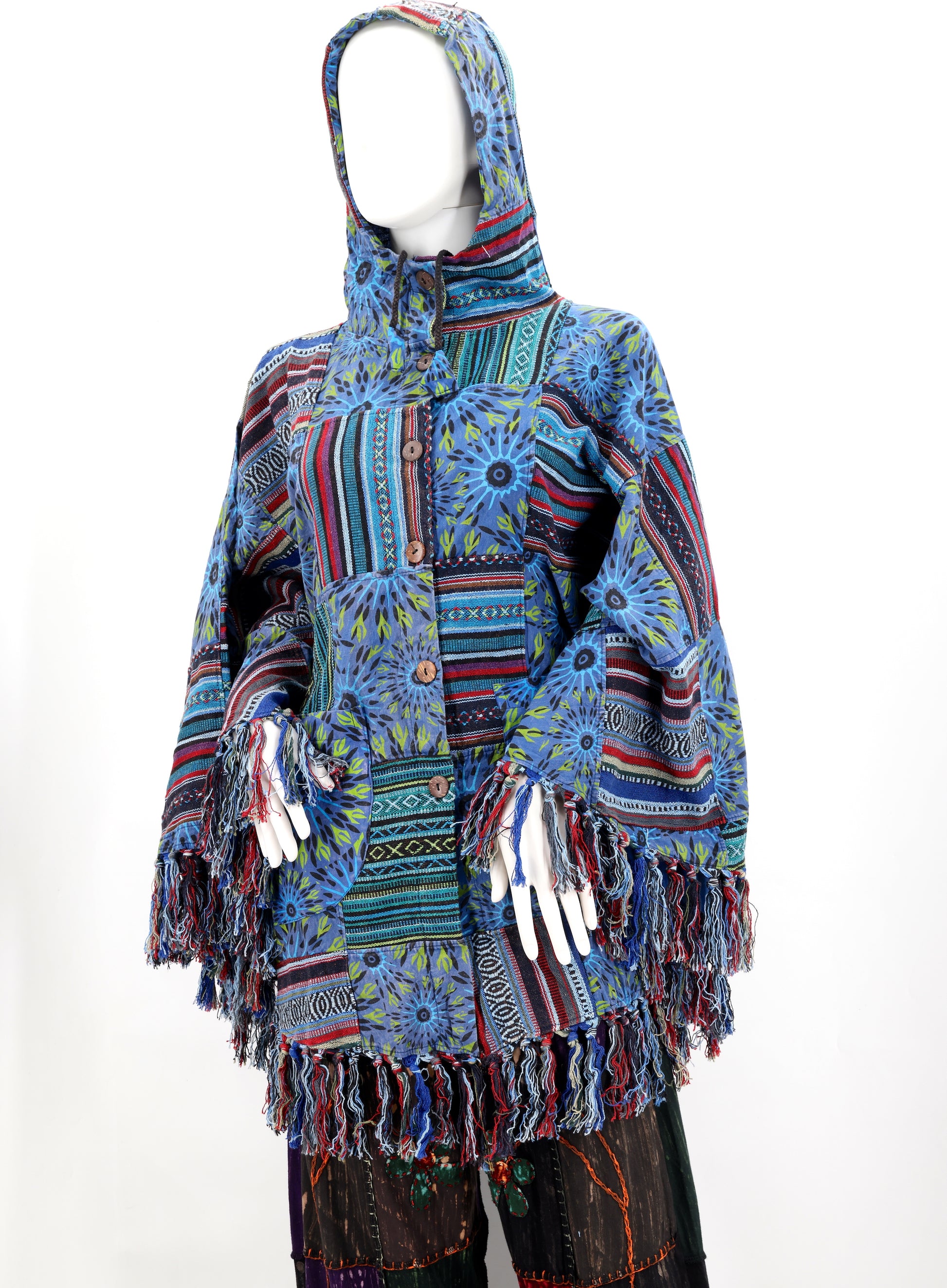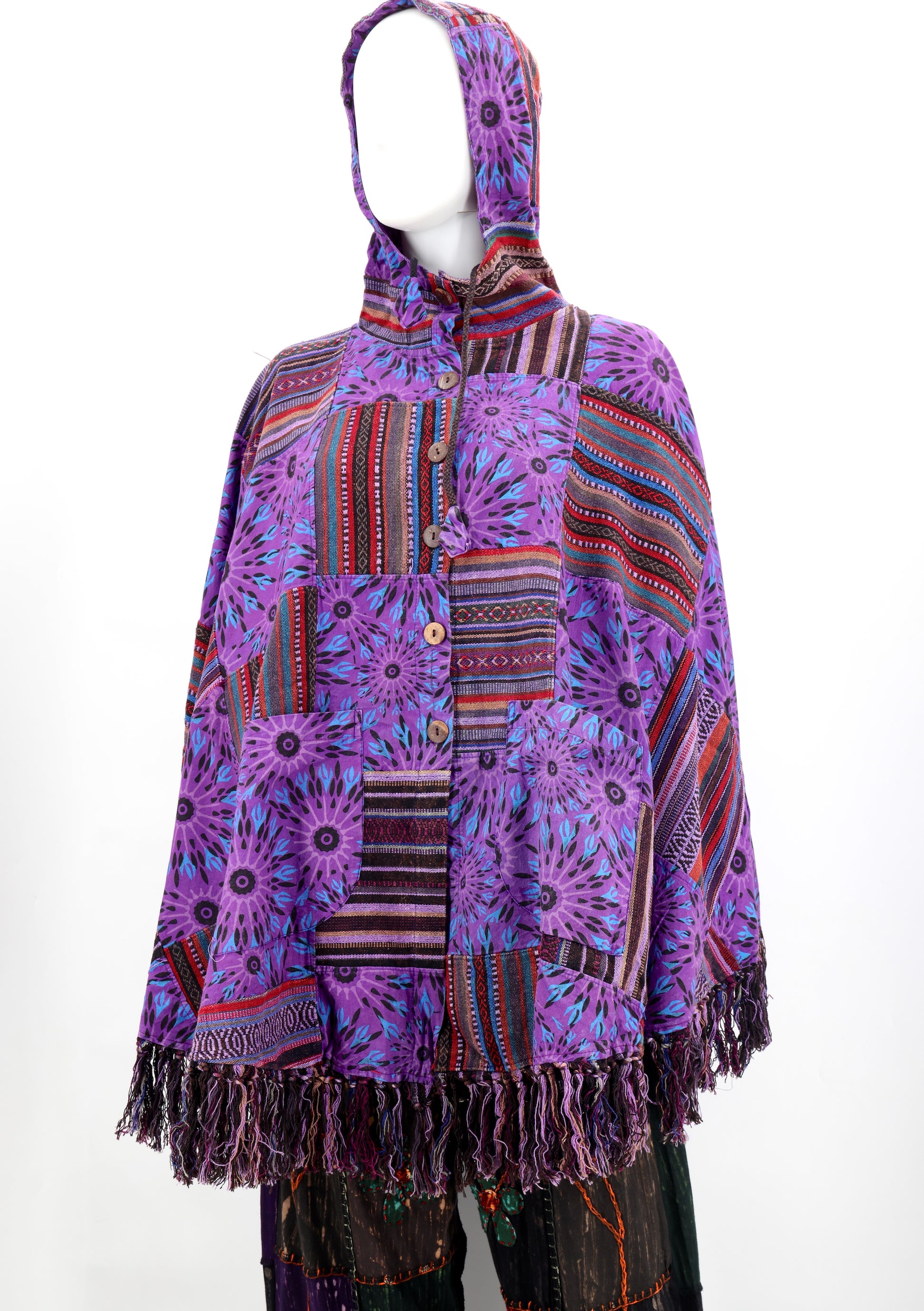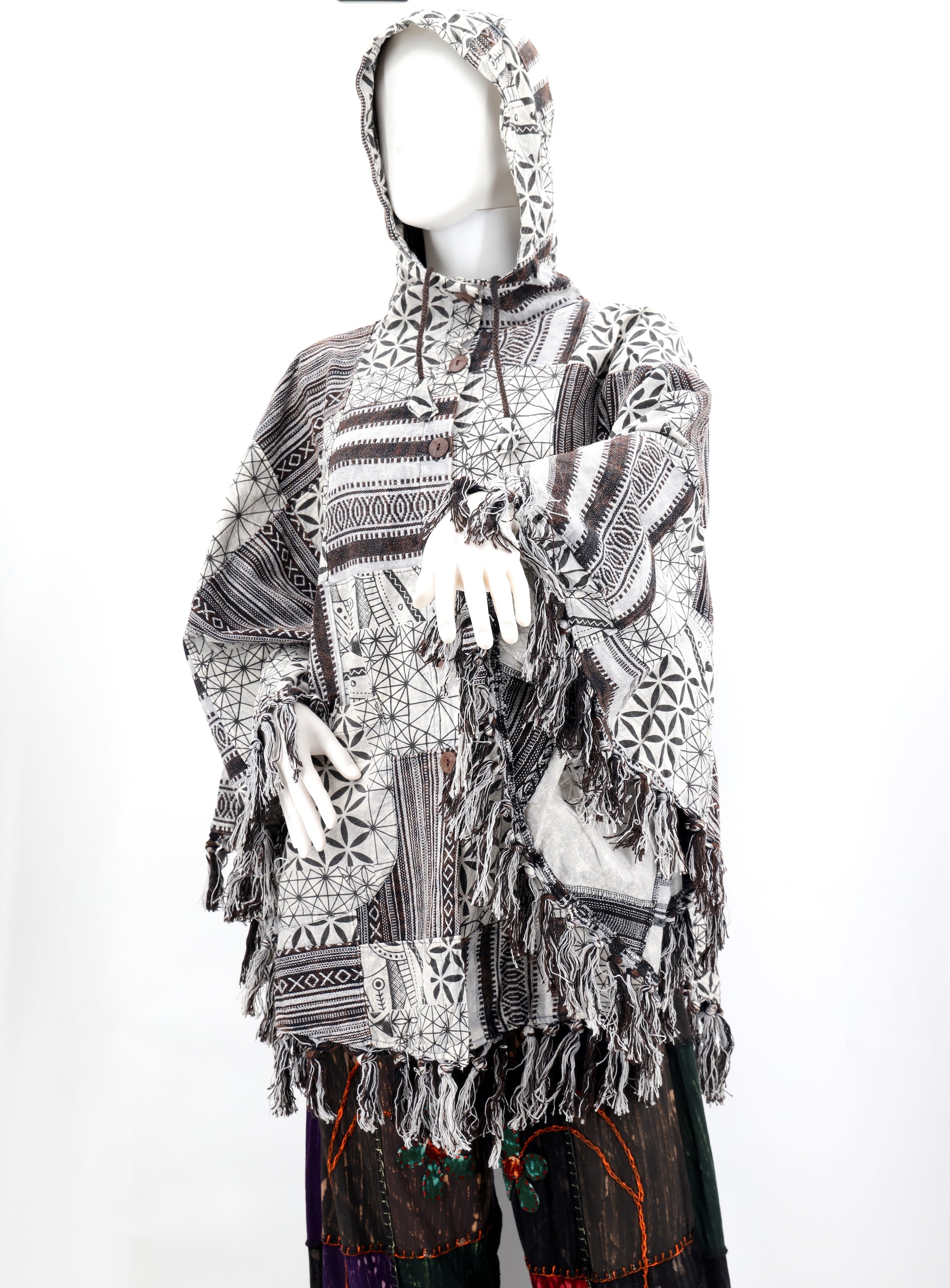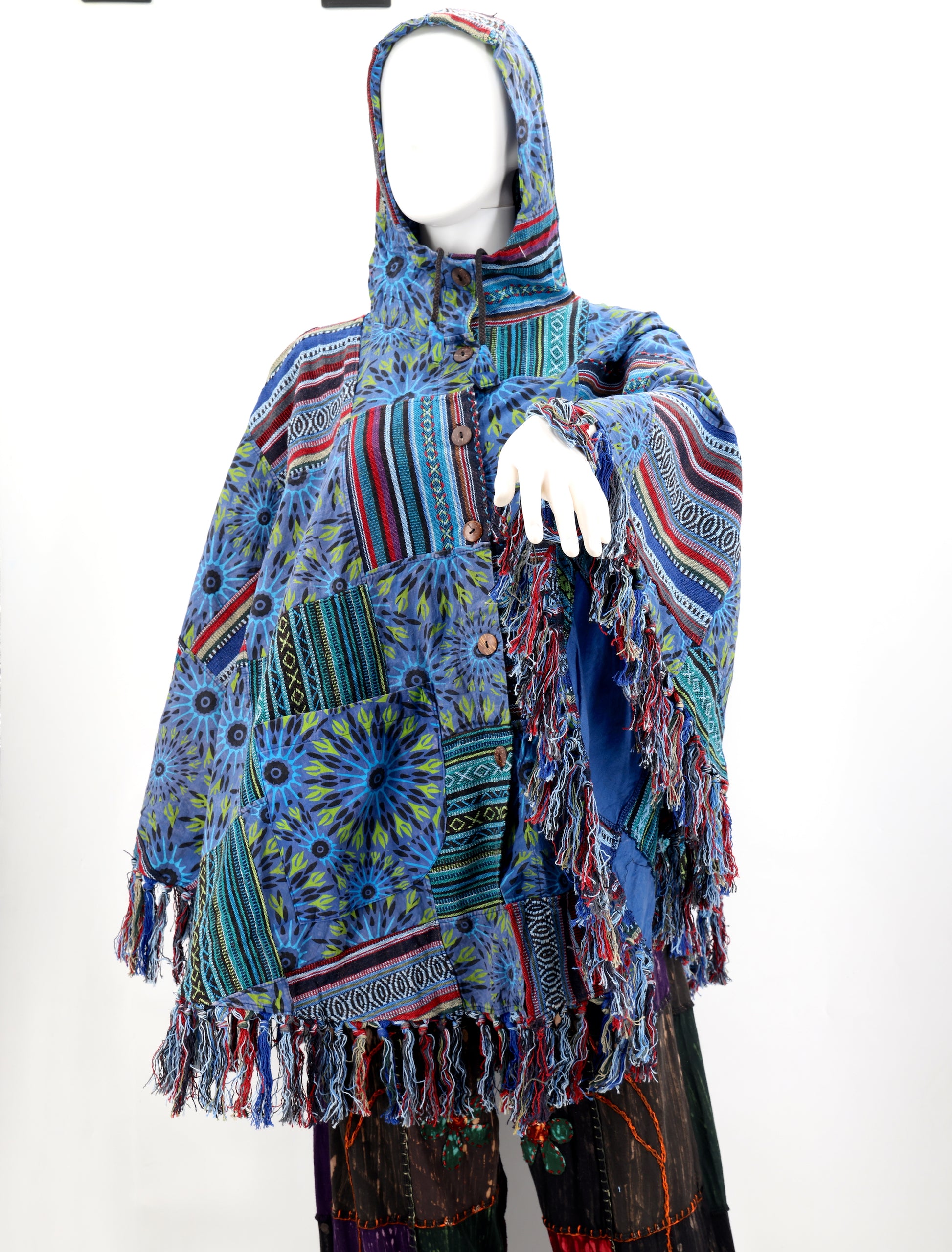 Cotton Hippie Handmade Geometric Patterned Patchwork Bohemian Poncho with Tassels